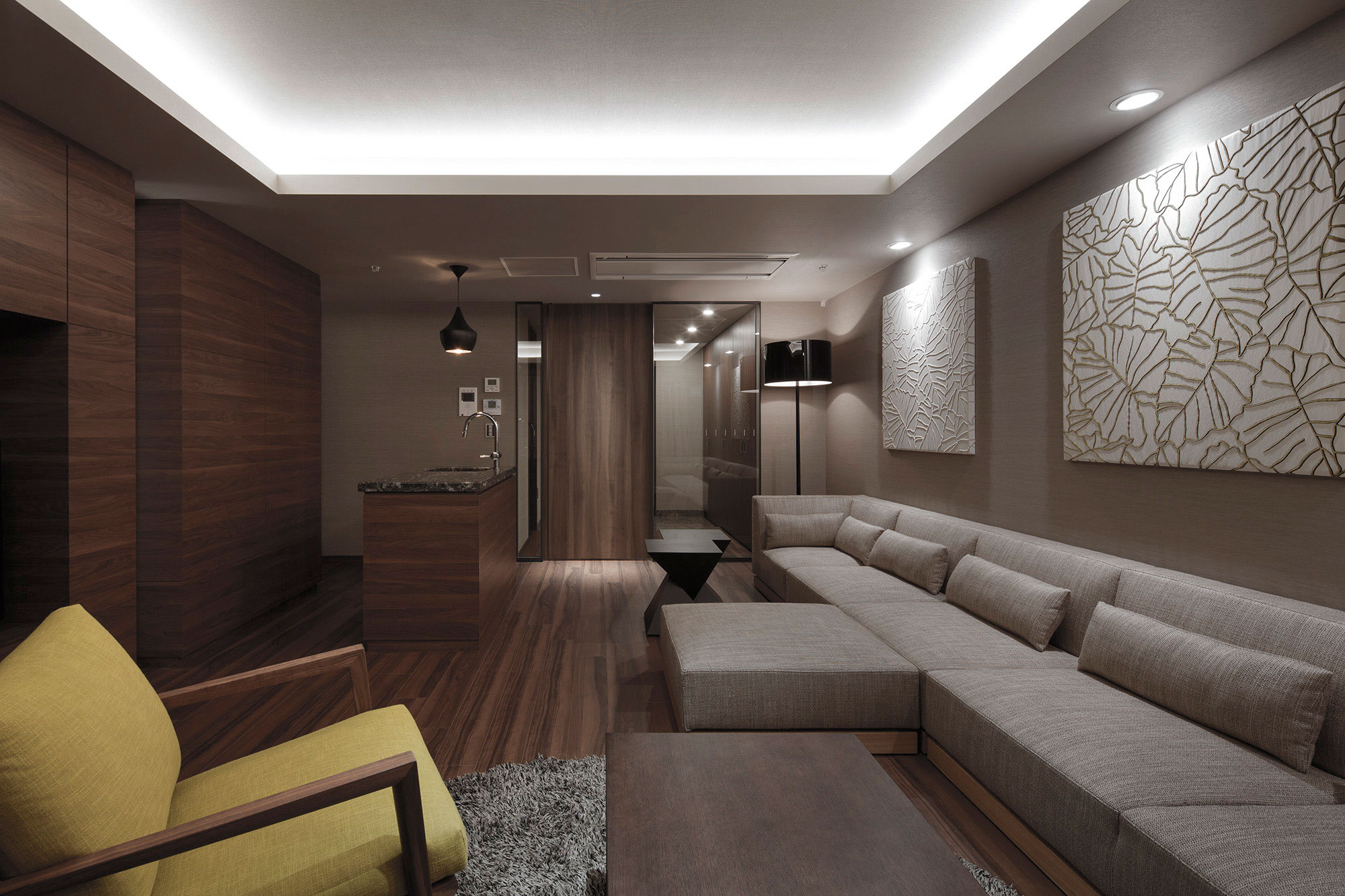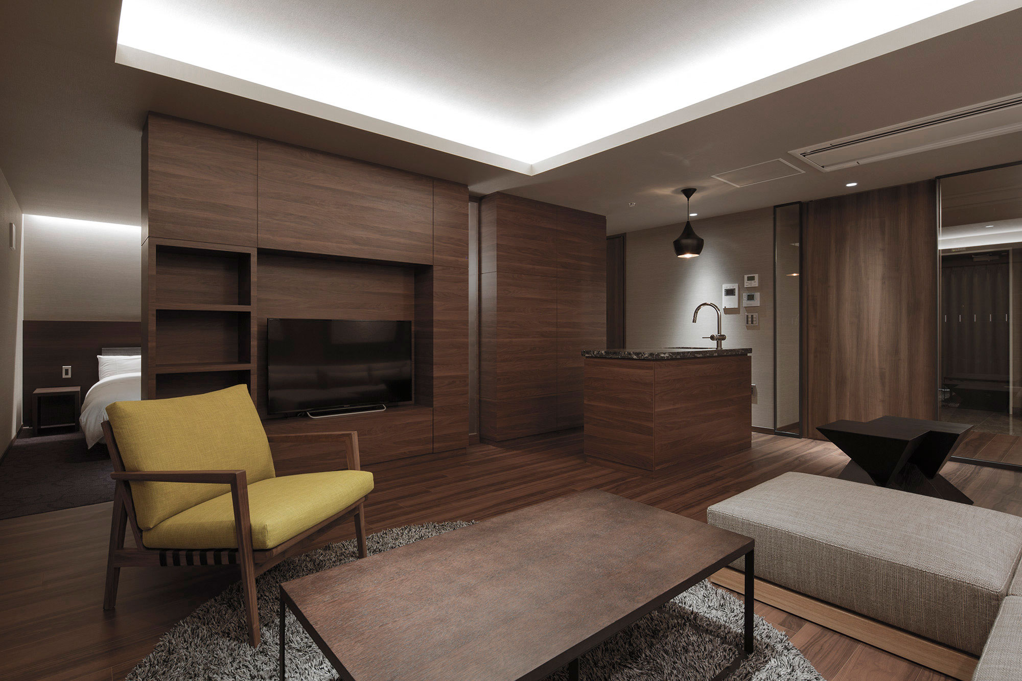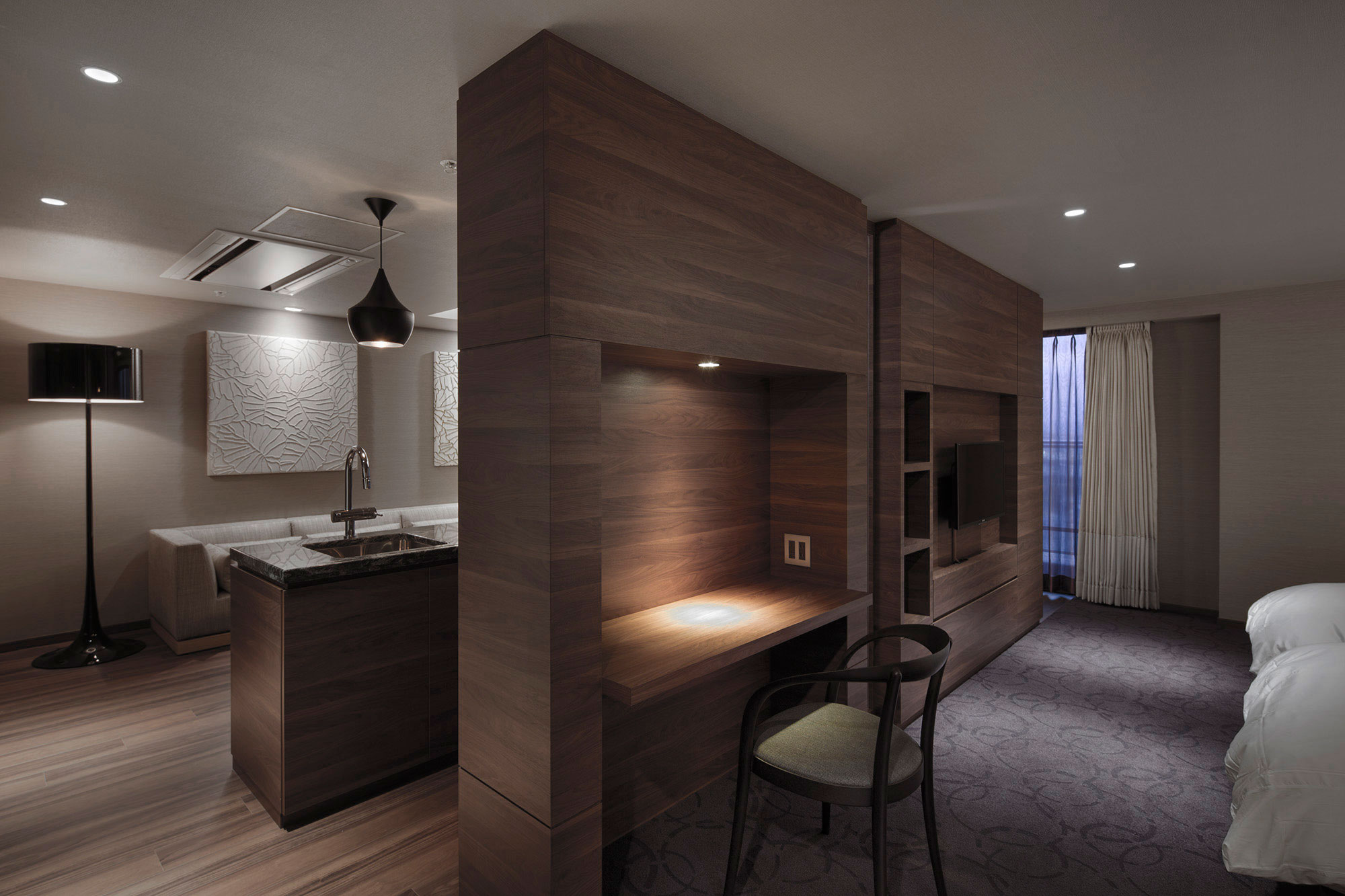 大空間のエントランスホールは、ガラスパーテーションを使って緩やかに空間を仕切ることでバランスの良い「間」を生み出している。スカイラウンジでは、6メートルほどをカウンターを象徴的にレイアウトしたダイナミックな空間とした。ゲストルームも大人数で利用ができるように空間の仕切り方に工夫をしている。