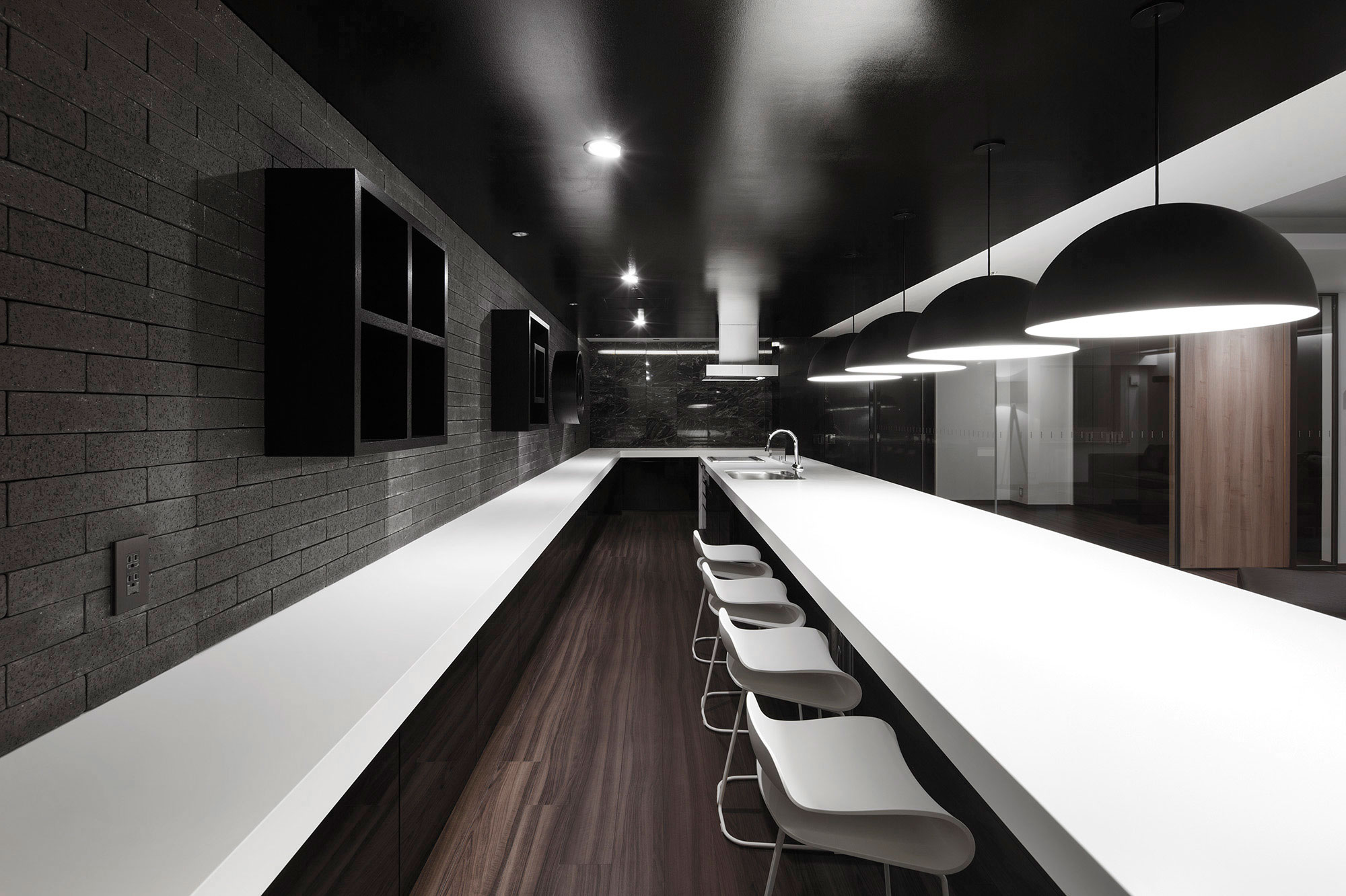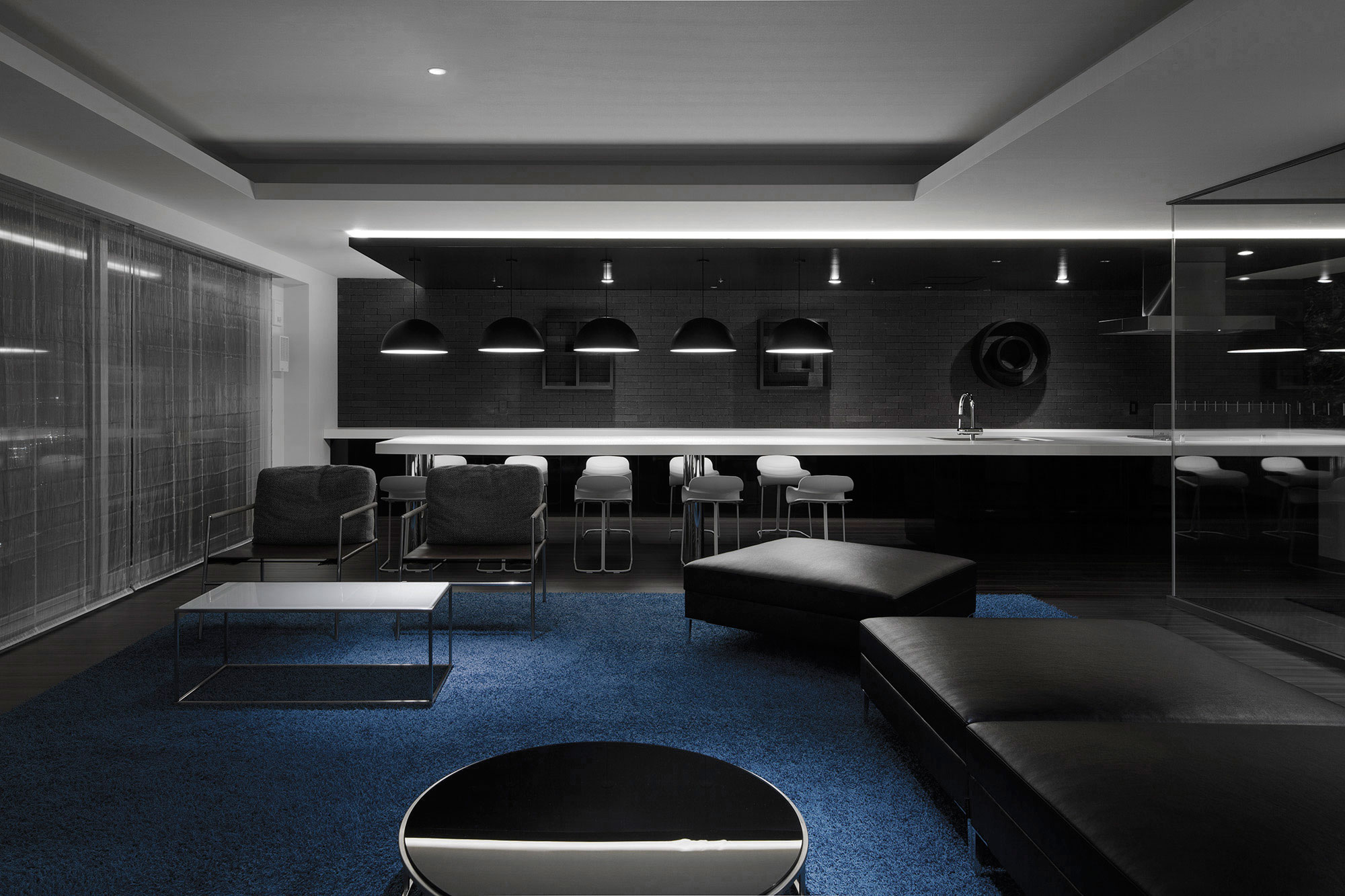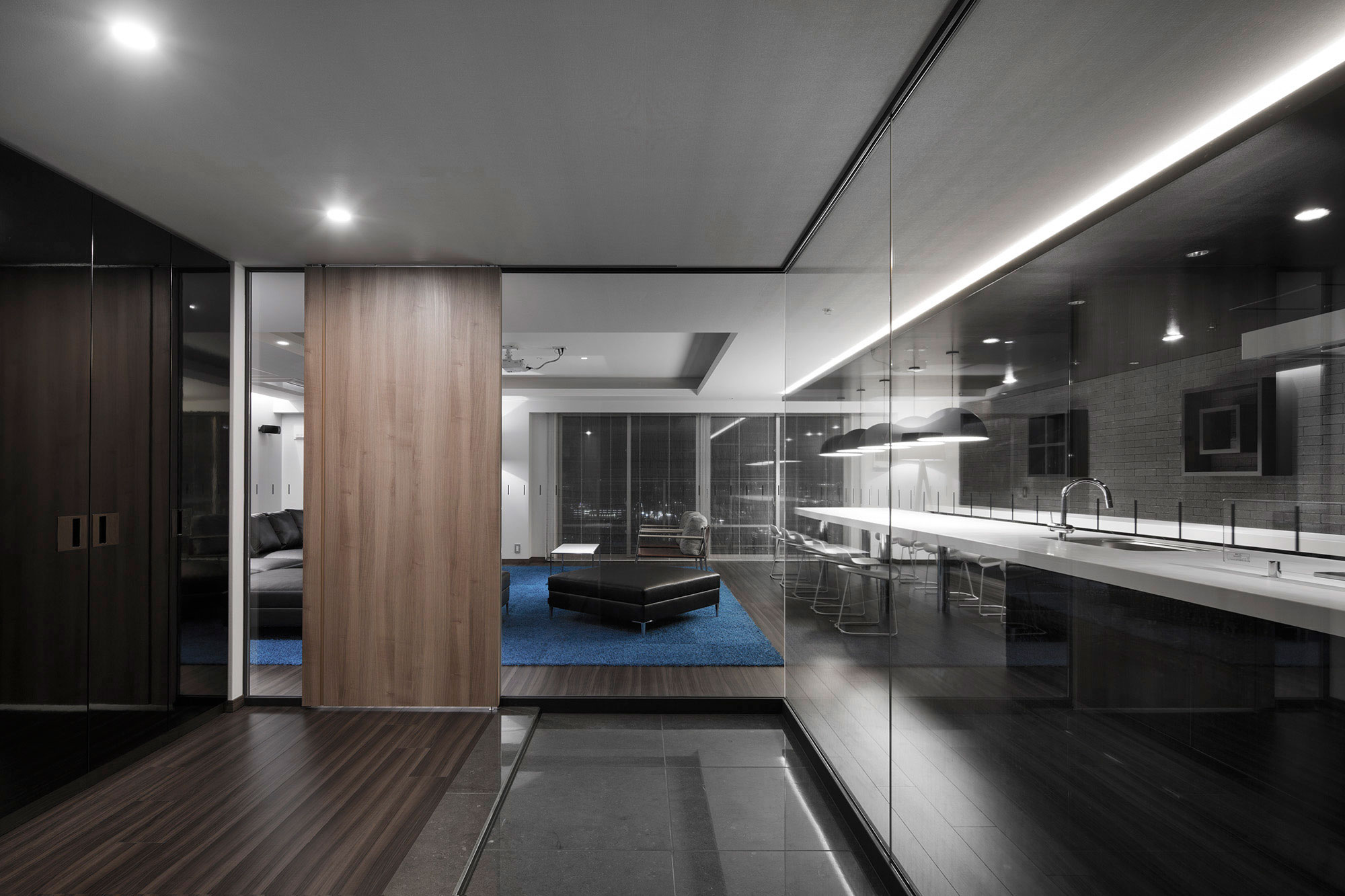 大空間のエントランスホールは、ガラスパーテーションを使って緩やかに空間を仕切ることでバランスの良い「間」を生み出している。スカイラウンジでは、6メートルほどをカウンターを象徴的にレイアウトしたダイナミックな空間とした。ゲストルームも大人数で利用ができるように空間の仕切り方に工夫をしている。