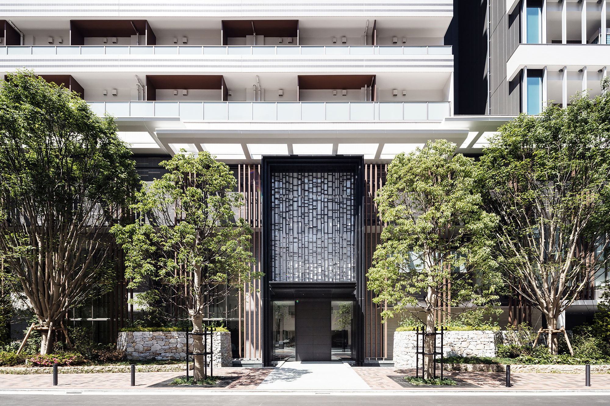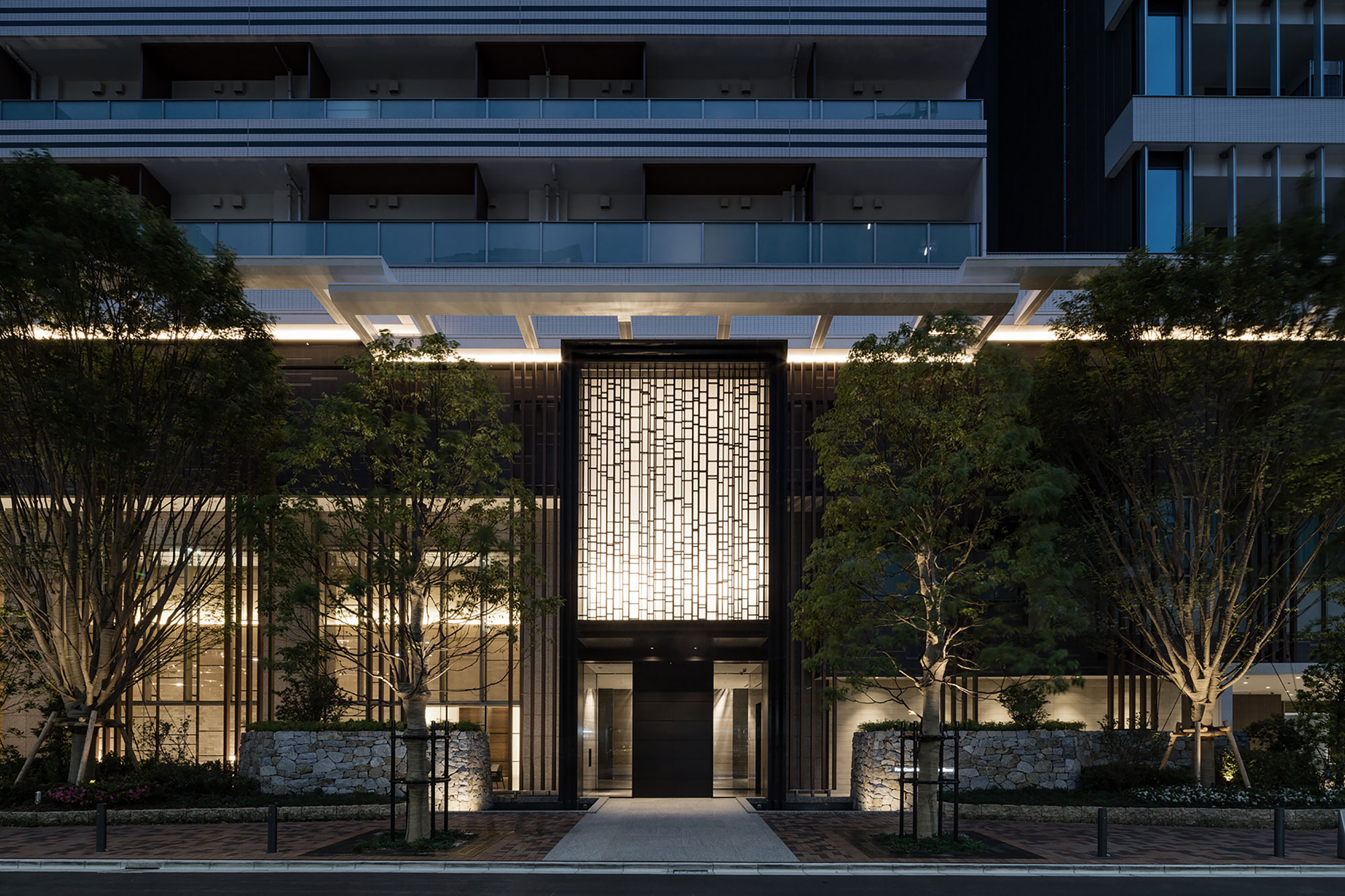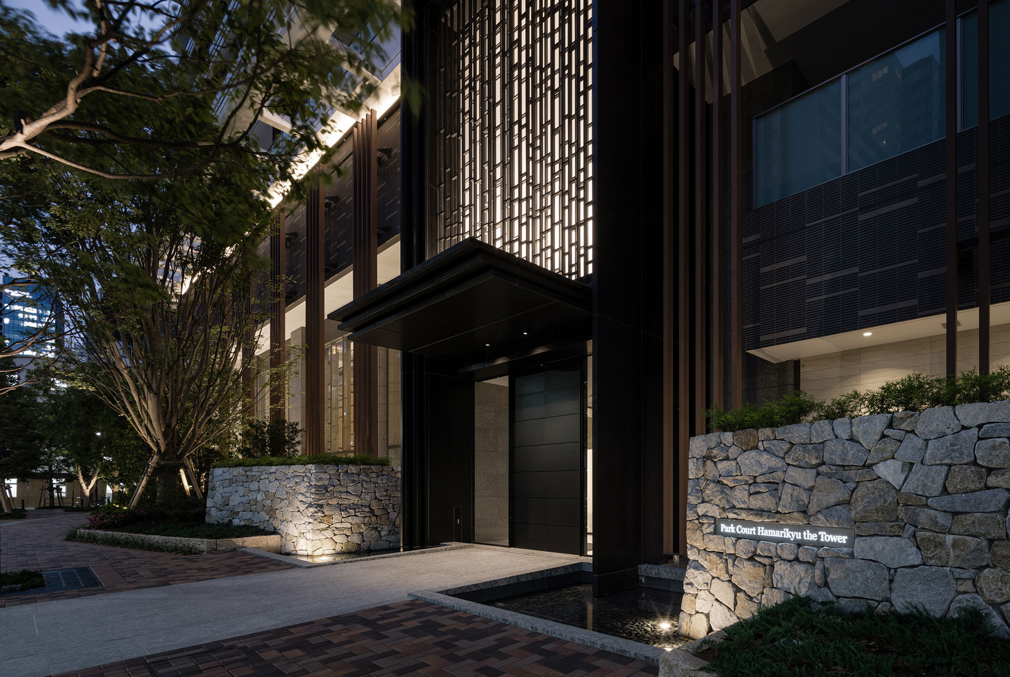 アプローチを意識したエントランスファサードデザインでは、植栽の先にラウンジ上部に吊るされたライティングオブジェが見えることで期待感を高めます。喧騒に囲まれた都市空間から、「住まい」としての寛ぎの空間へと緩やかに導く、大きくゆったりとした構えと、質の高い光の演出とアートエレメントを設えたエントランスラウンジに迎えられ、それぞれの住まう人々の専有部へと結ぶ。細部にこだわったディティールを折り重ねて、質の高い空間が目指した。そして専有部の機能を補完するための機能を追求した共用施設には、浜離宮を一望できるラウンジ、浜離宮の汐入の池を模したゲストルーム、吹き抜けの中に静けさを作り出したライブラリーなどを様々なディスカッションを重ねて作り上げることができた。2020年度グッドデザイン賞。