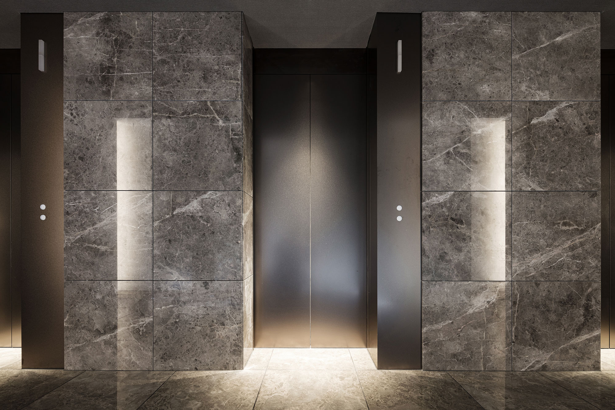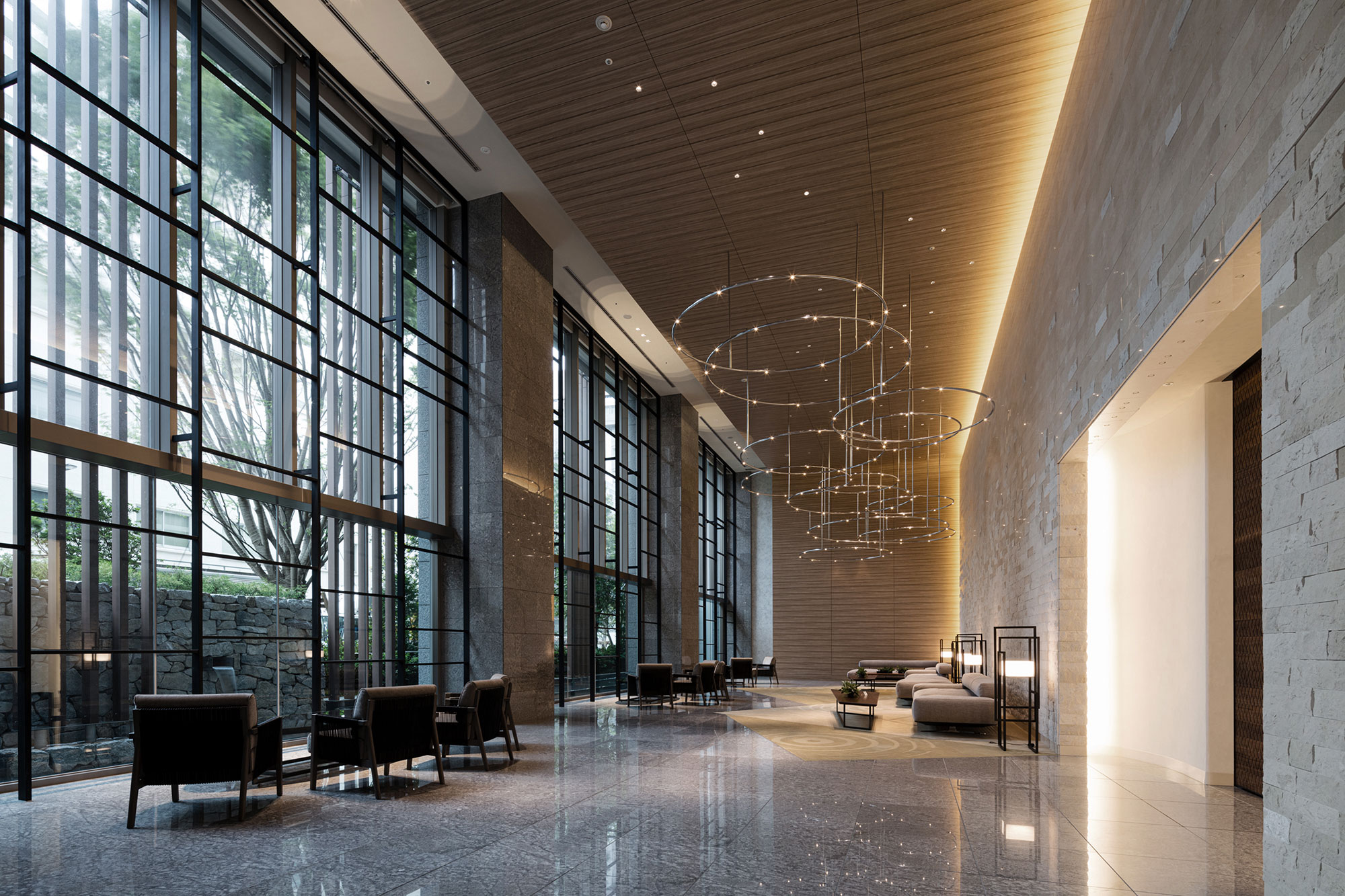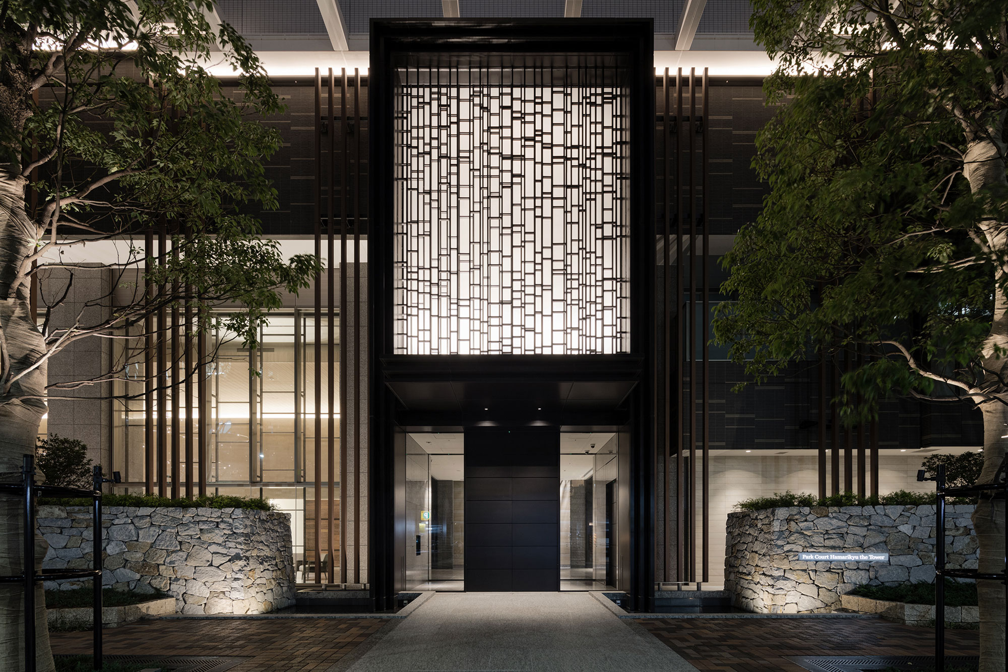 アプローチを意識したエントランスファサードデザインでは、植栽の先にラウンジ上部に吊るされたライティングオブジェが見えることで期待感を高めます。喧騒に囲まれた都市空間から、「住まい」としての寛ぎの空間へと緩やかに導く、大きくゆったりとした構えと、質の高い光の演出とアートエレメントを設えたエントランスラウンジに迎えられ、それぞれの住まう人々の専有部へと結ぶ。細部にこだわったディティールを折り重ねて、質の高い空間が目指した。そして専有部の機能を補完するための機能を追求した共用施設には、浜離宮を一望できるラウンジ、浜離宮の汐入の池を模したゲストルーム、吹き抜けの中に静けさを作り出したライブラリーなどを様々なディスカッションを重ねて作り上げることができた。2020年度グッドデザイン賞。