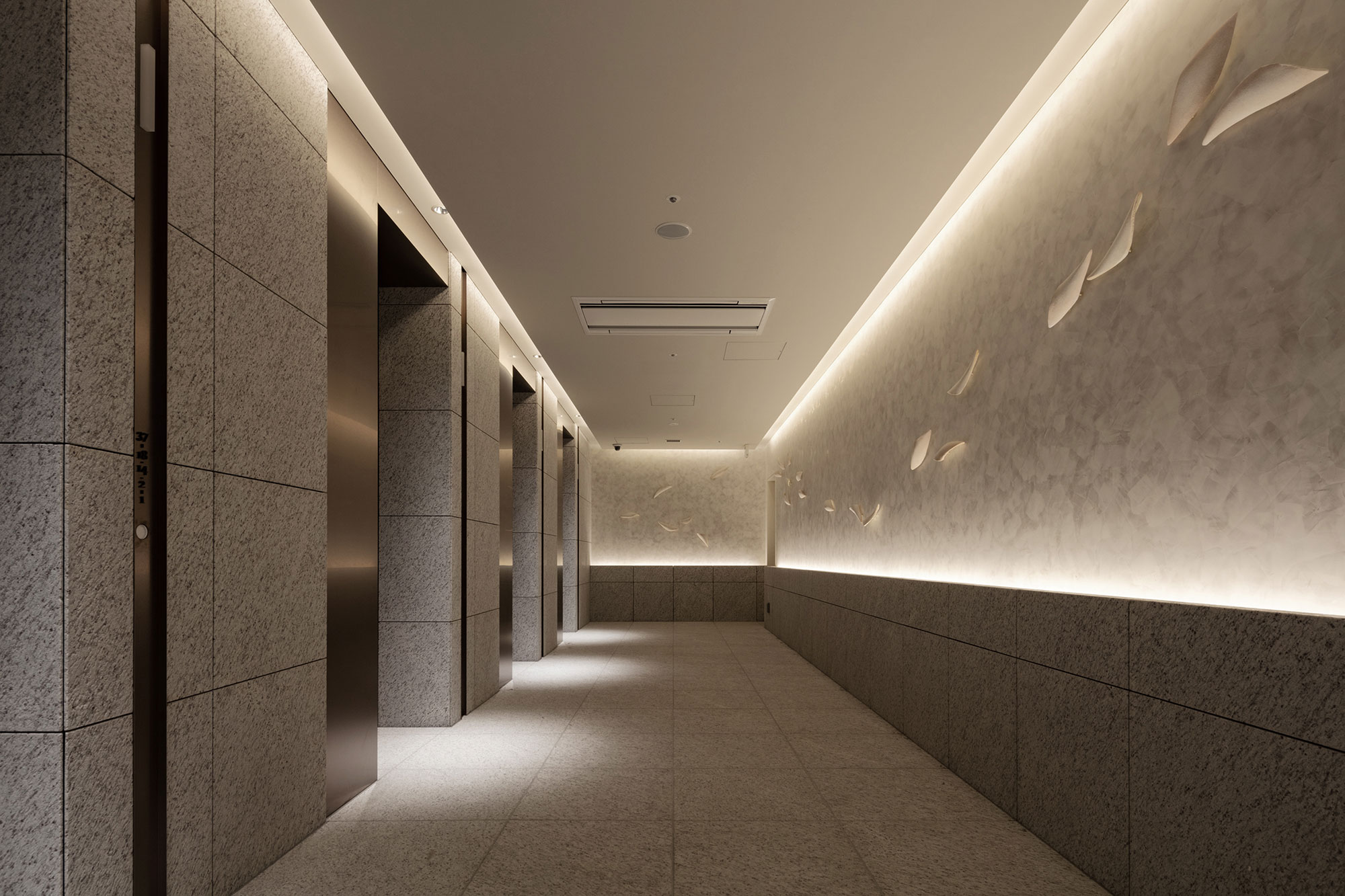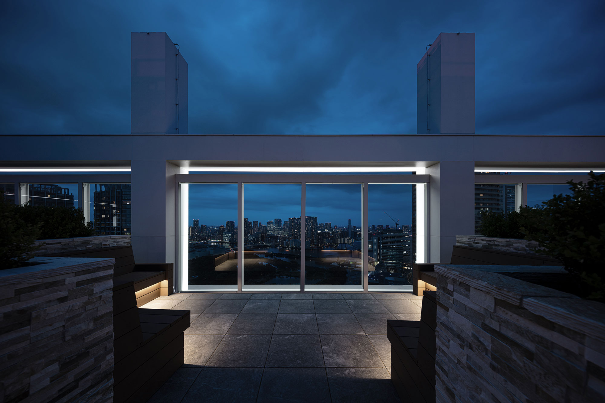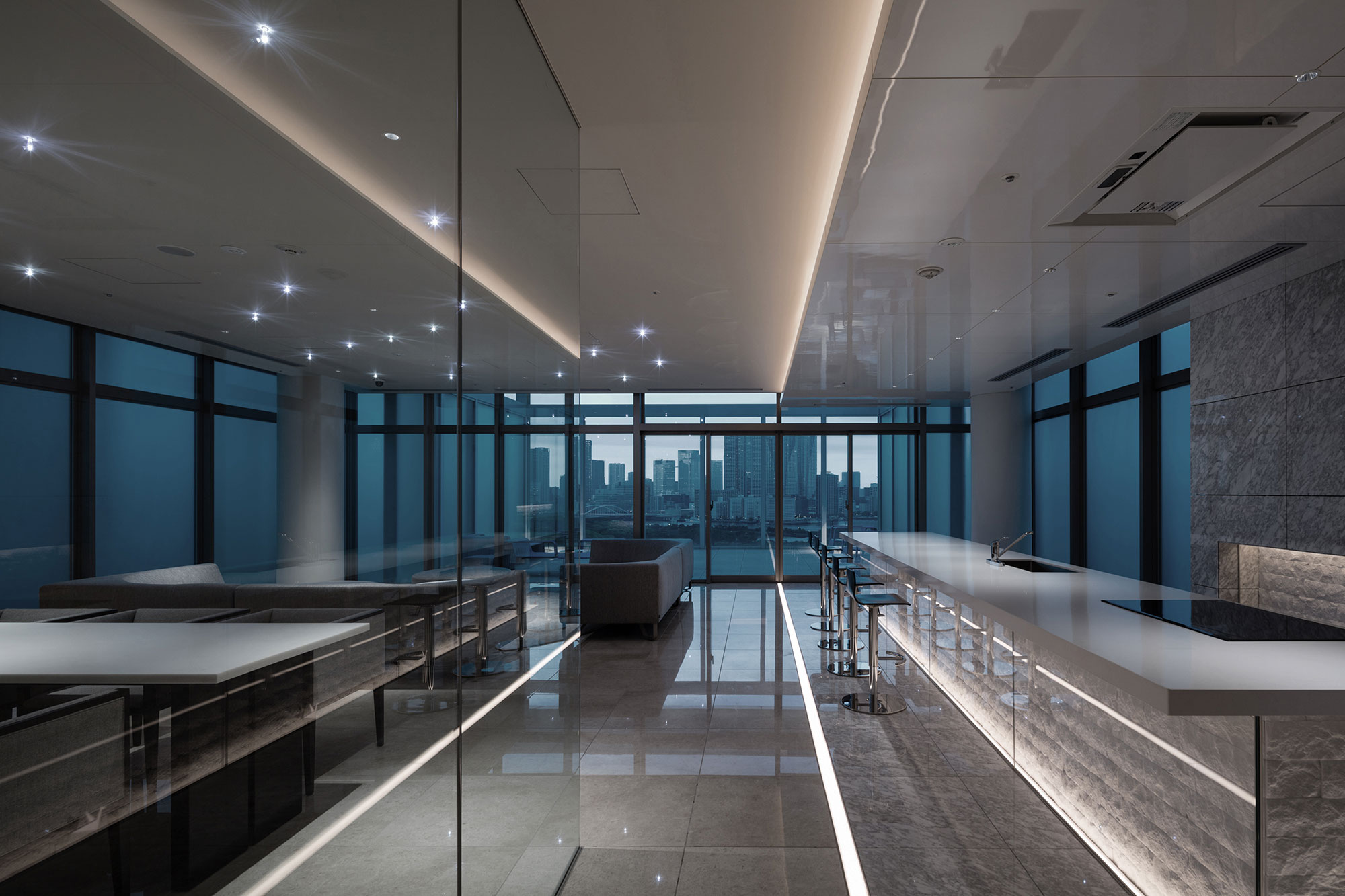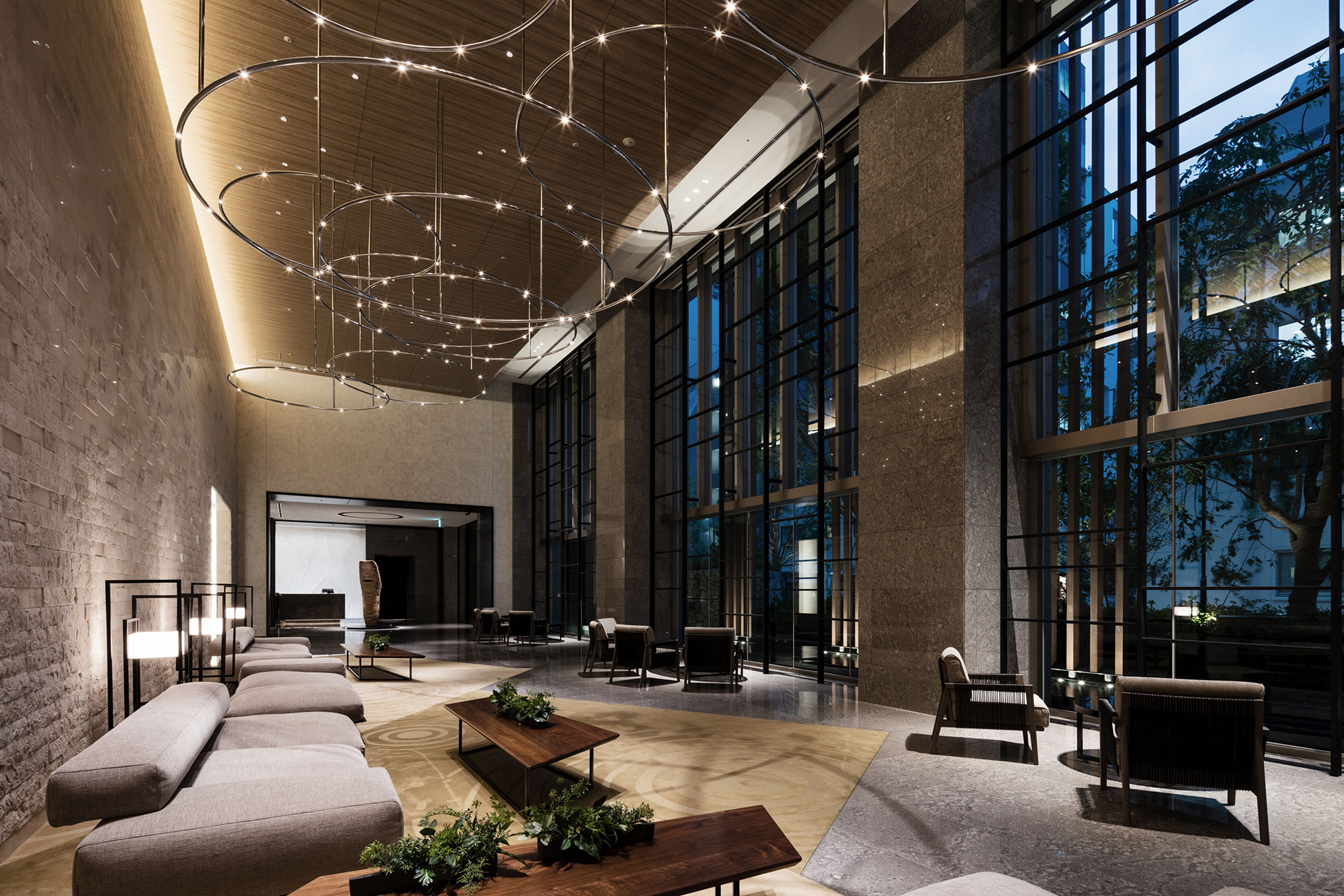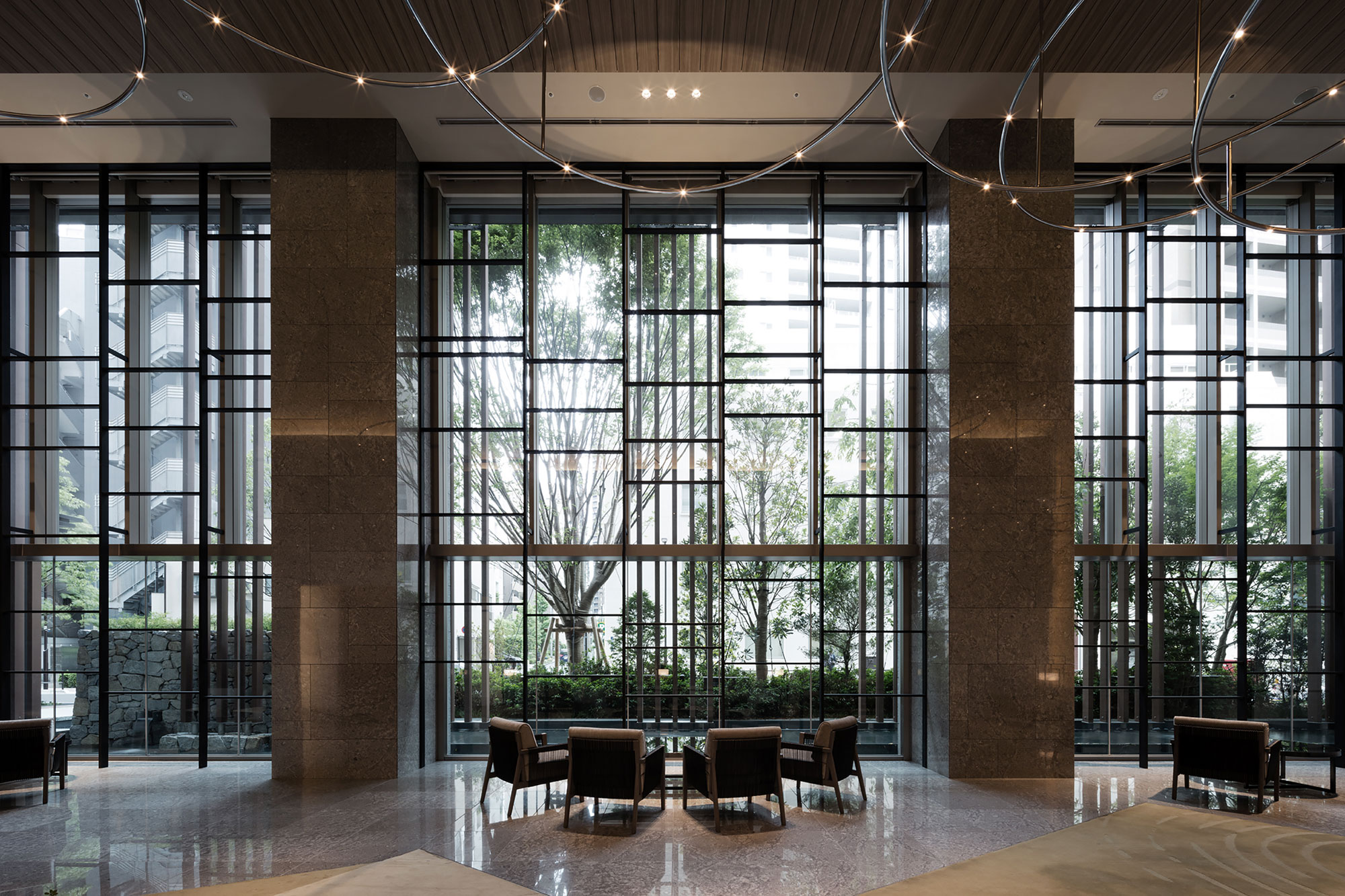 The approach-conscious entrance façade design raises expectations by seeing the lighting objects hung above the lounge at the end of the planting. We were greeted by the entrance lounge, which has a large and spacious stance that gently leads from the hustle and bustle of the urban space to a relaxing space as a "house", and high-quality light production and art elements. Connect to the exclusive department of the people who live. By folding the details that were particular about the details, we aimed for a high-quality space. And in the shared facilities that pursued the function to complement the function of the exclusive part, there are various lounges overlooking Hamarikyu, guest rooms that imitate the Shioiri pond of Hamarikyu, and a library that creates tranquility in the atrium. I was able to create it through repeated discussions. 2020 Good Design Award.