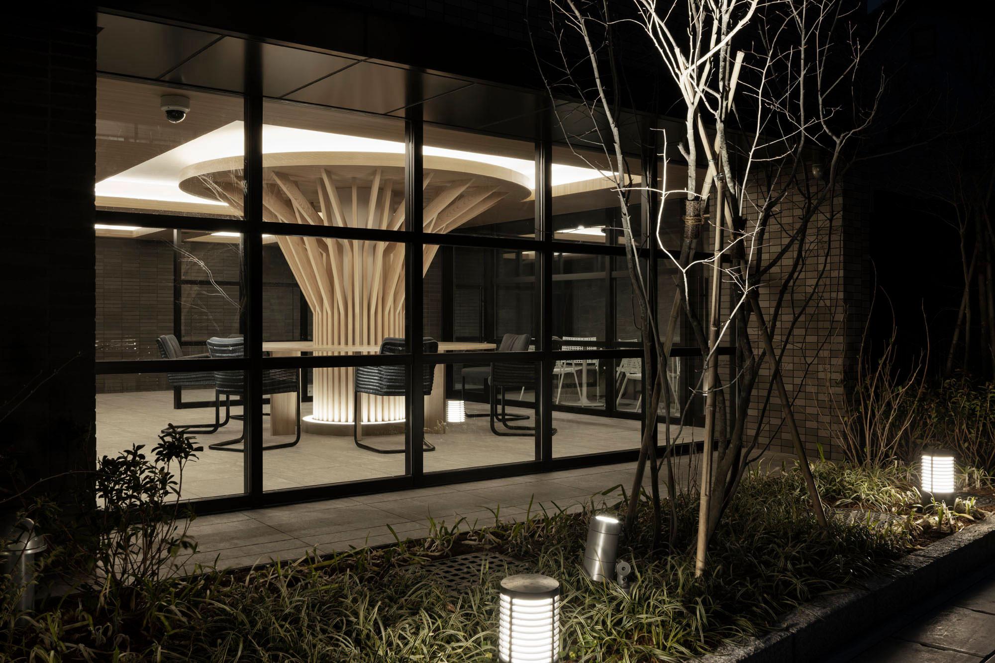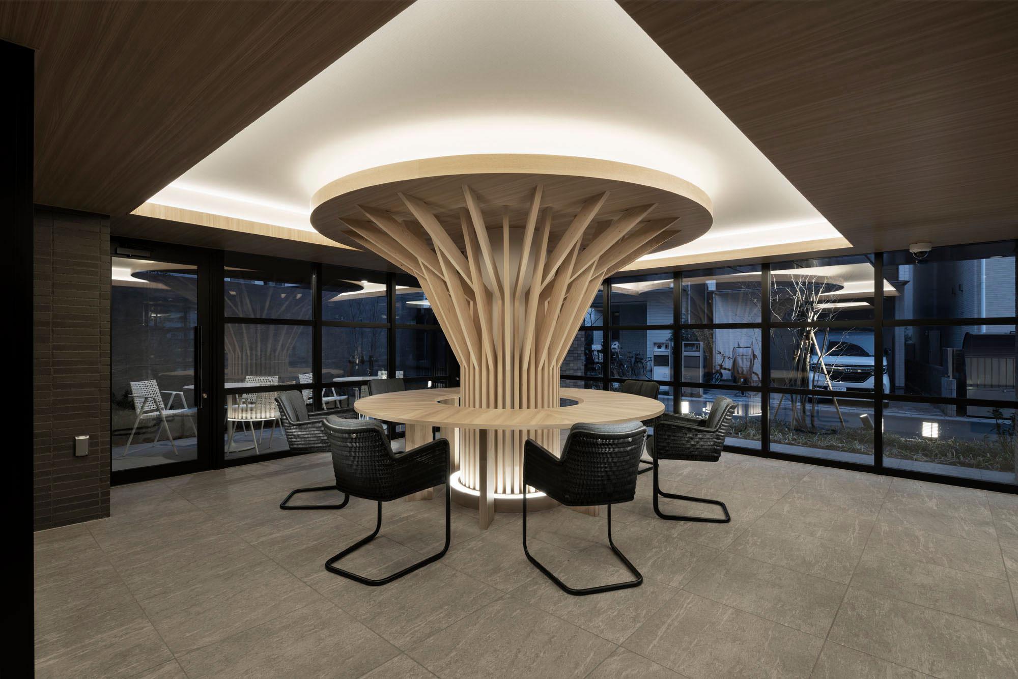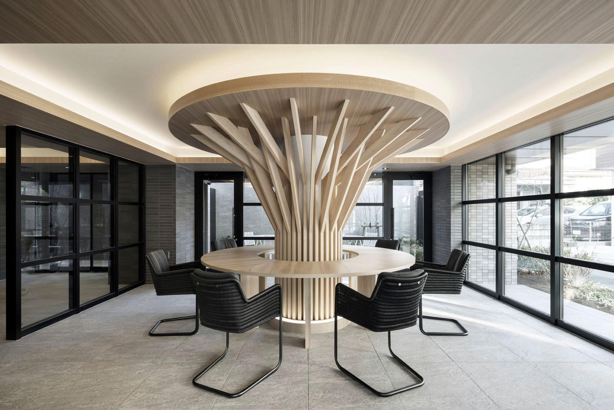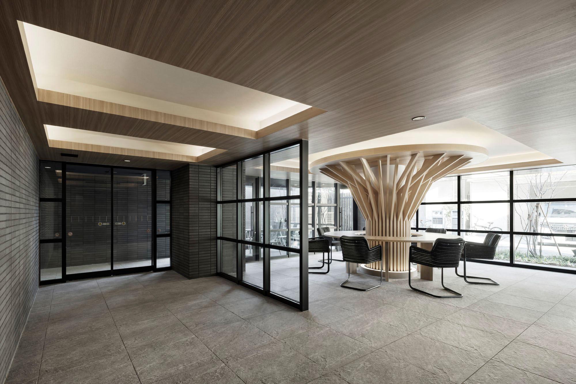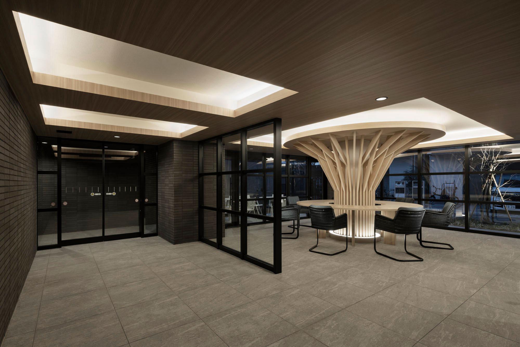 モノトーンの落ち着いた外観デザインと温もりを感じエントランスに導かれる。木陰で人々が集まり、穏やかな日常を織りなす。