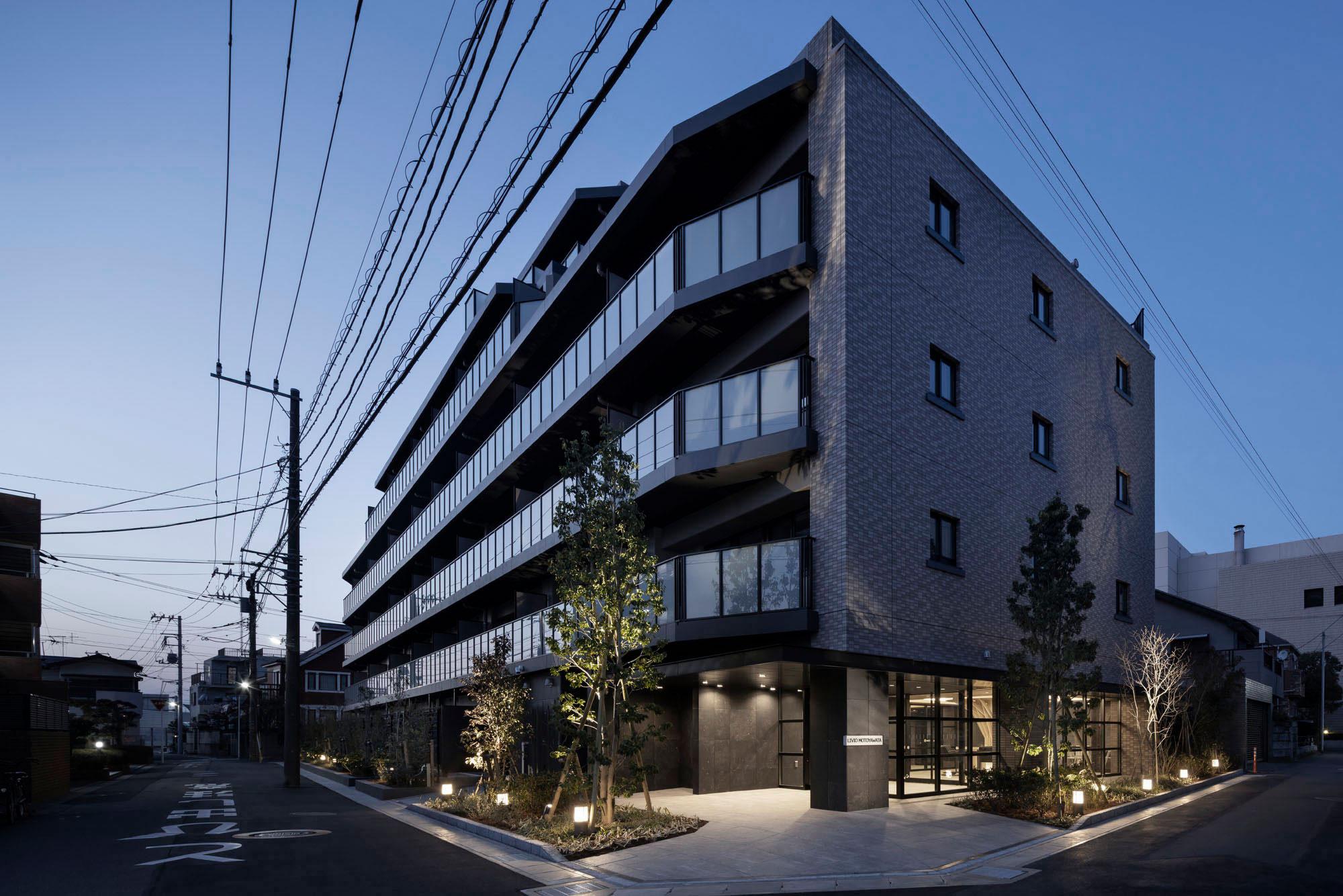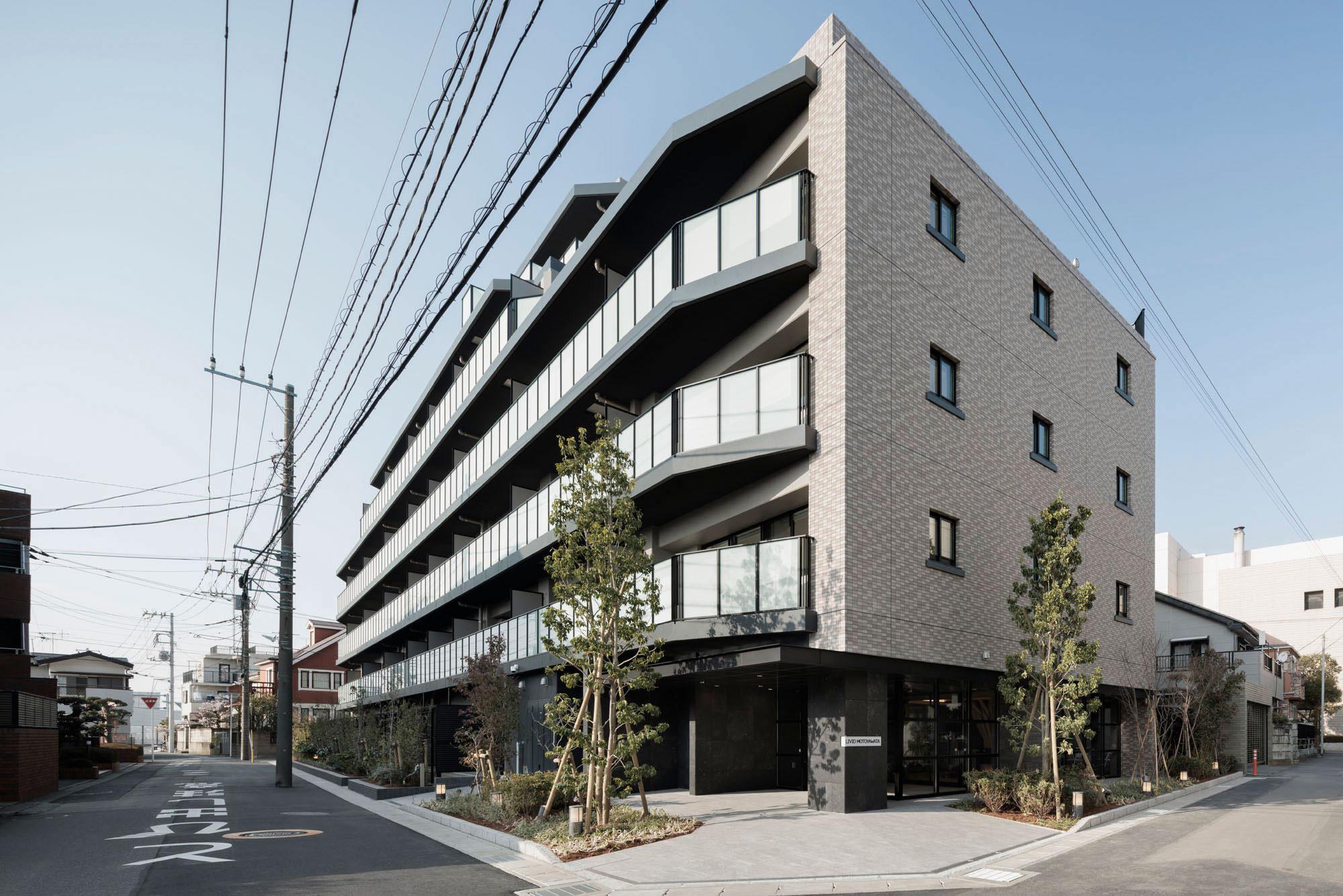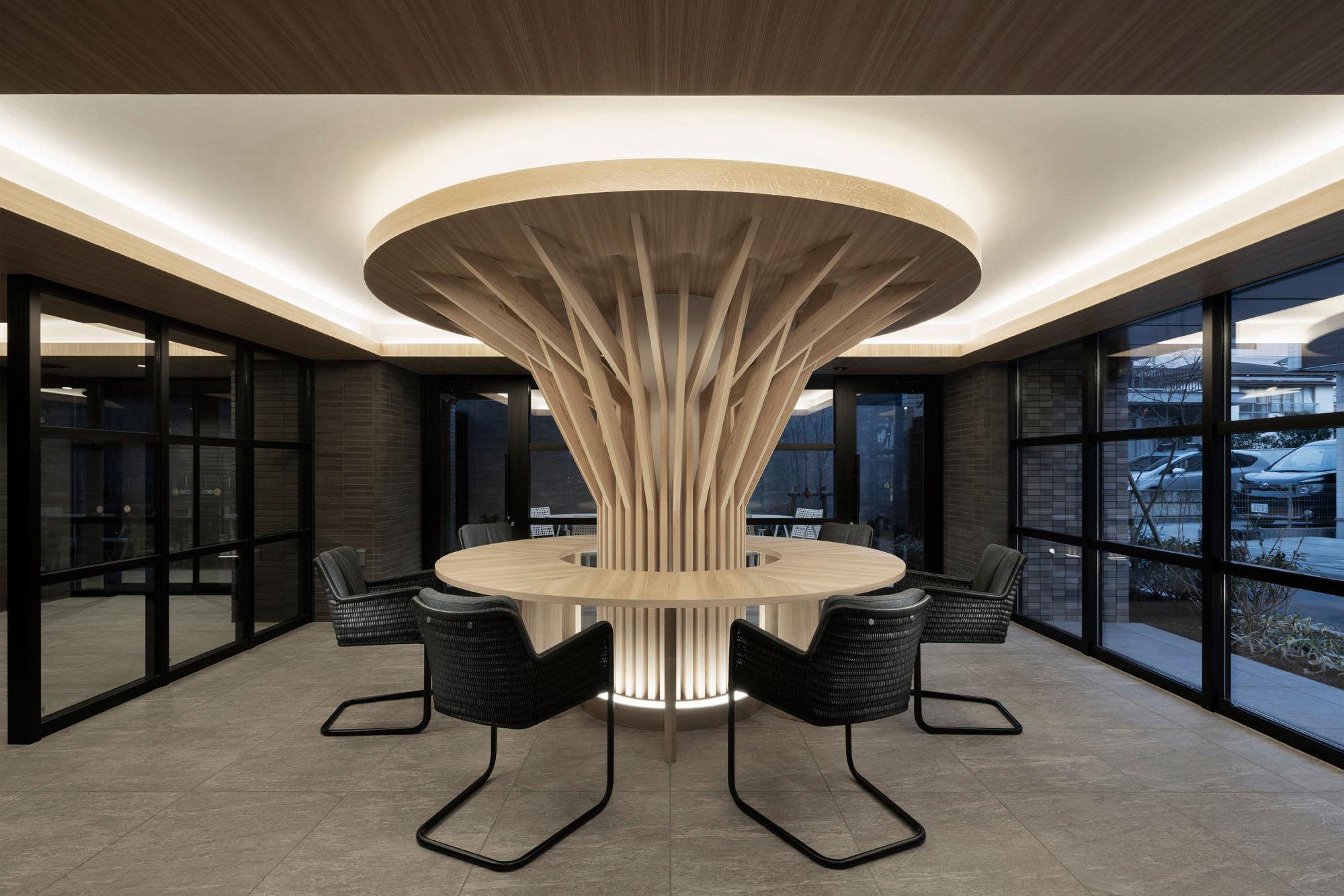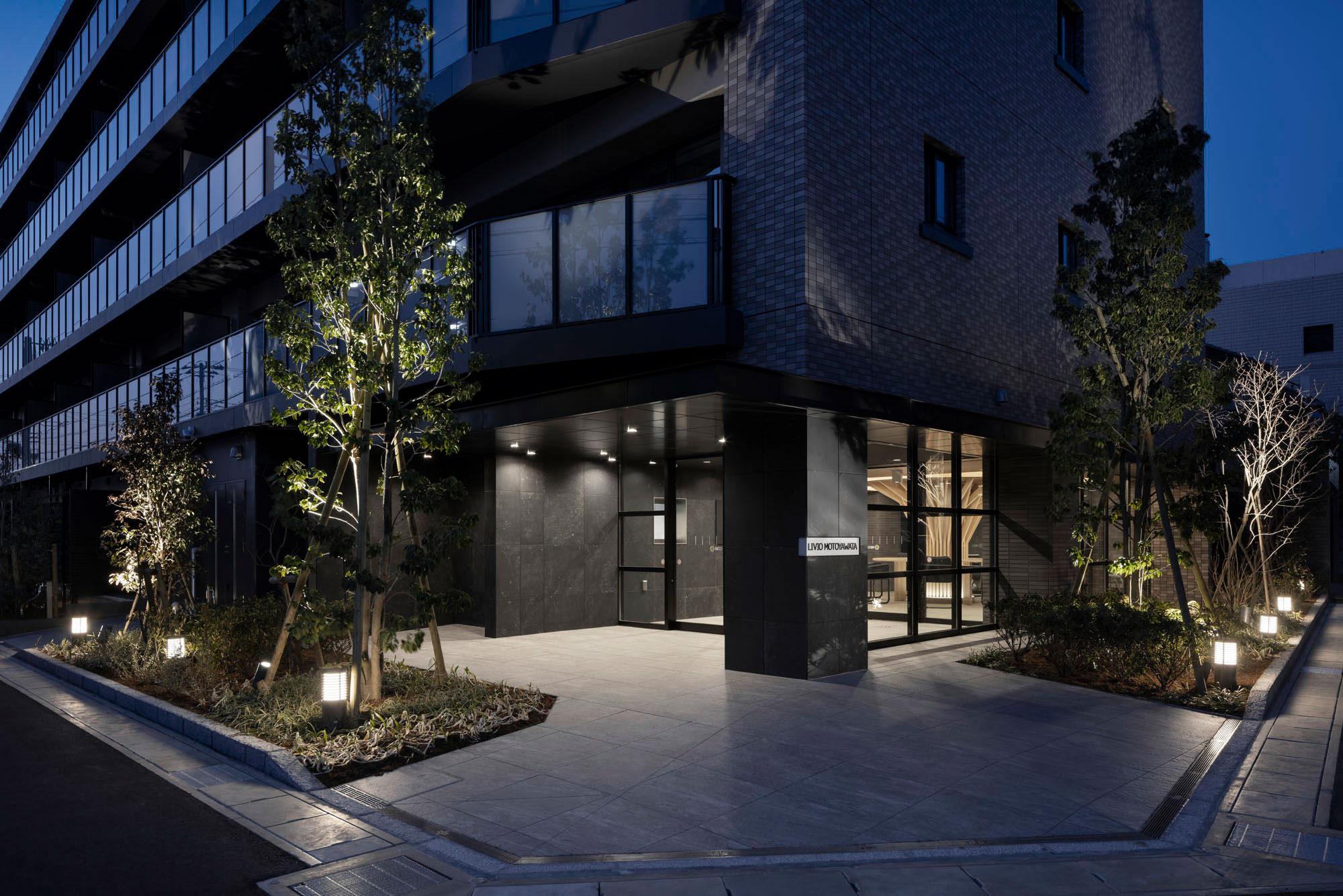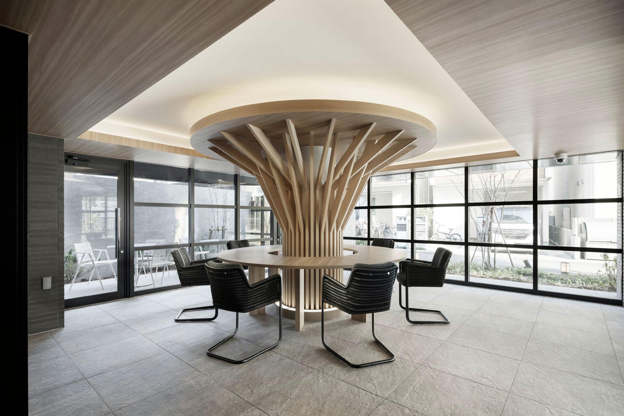 モノトーンの落ち着いた外観デザインと温もりを感じエントランスに導かれる。木陰で人々が集まり、穏やかな日常を織りなす。