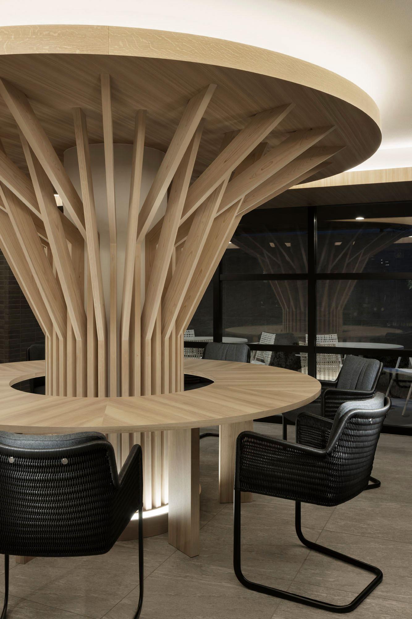 Let to the entrance where you can feel the calm monotone exterior design and warmth. People gather in the shade of trees and weave a calm daily life.